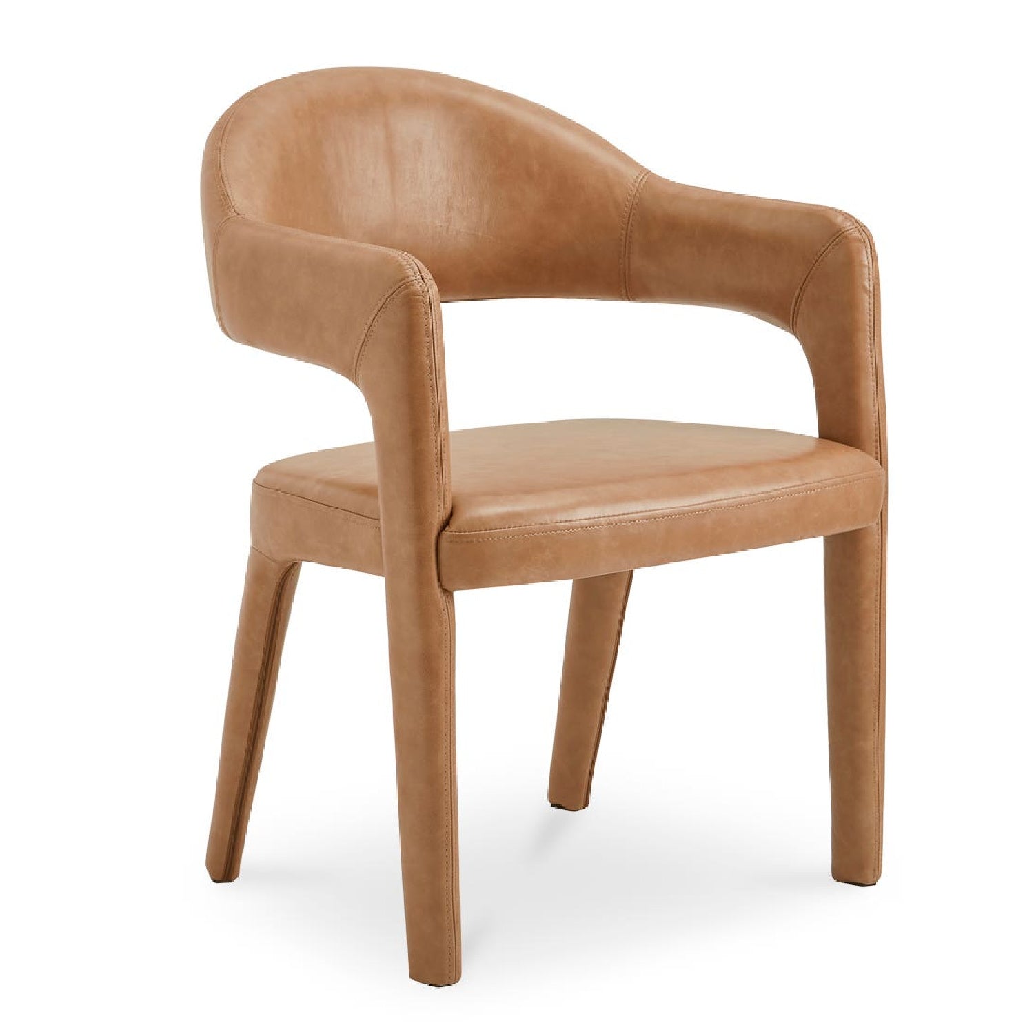 One smooth move. The Martens Dining Chair flows in a continuous curve from arm to leg, creating a sculpted seat that looks as good as it feels. An open barrel back keeps the silhouette airy, while plush foam padding offers comfort without the bulk. Wrapped in warm camel upholstery and supported by a sturdy iron frame, Martens balances soft shape with everyday strength.