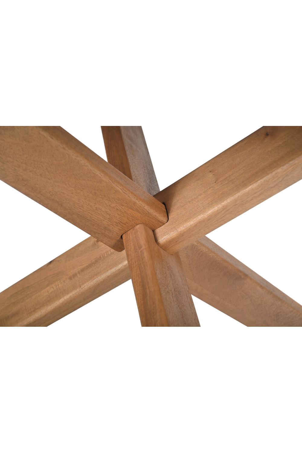 The Wesley dining table's base, crafted from three interlocking legs, creates a clean, crisscross structure that eliminates visible hardware. Mango wood, finished in vintage brown with a subtle sandblasted texture, creates a lighter hue that pairs with the airy base design for a contemporary feel.