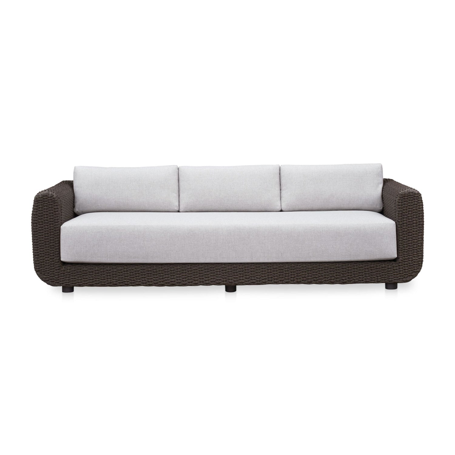 The Soma outdoor sofa finds a graceful interplay of form and purpose. The PE synthetic wicker frame and sunproof, heathered Olefin fabric cushions exude poise and durability. Curved, playful arms and quick-dry foam invite relaxation while ensuring timeless panache.