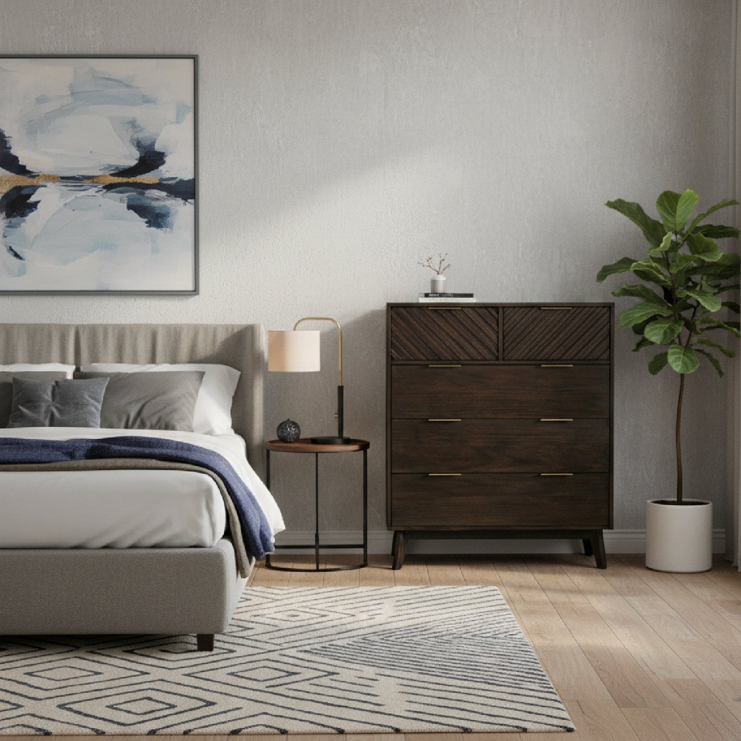 The Daisy Chest is the perfect collection of rustic materials to create a Mid-Century design. The carved chevron panels create visual interest and texture on the piece. The dark acacia solid wood construction is sturdy and beautiful while the brass handles create an industrial flair.