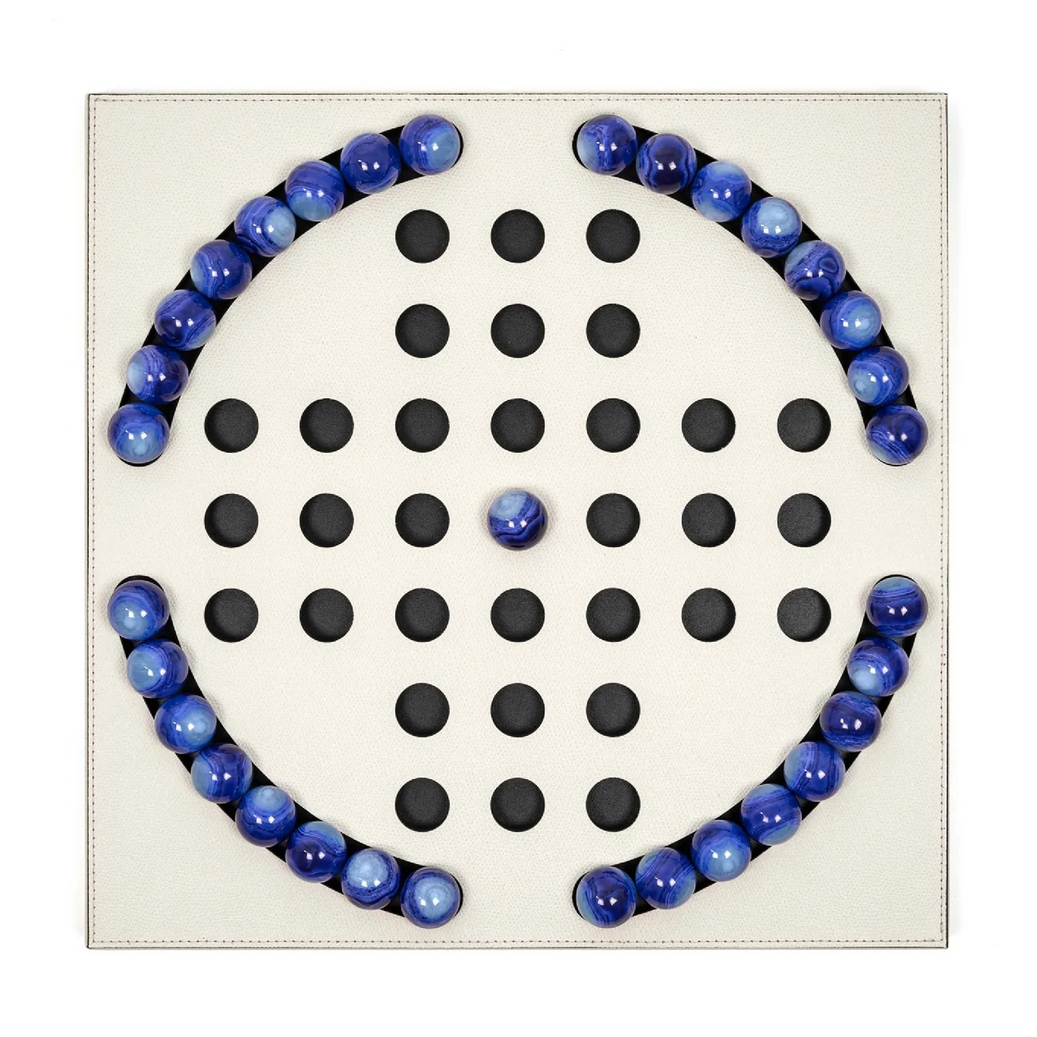 Elevate your leisure time with the Peg Solitaire featuring thirty-five eco-shell pawns in stunning blue hues, set against a refined cream leather board. This sophisticated game blends elegance with eco-conscious design, making it a captivating centerpiece for your collection and a perfect way to enjoy moments of thoughtful relaxation.