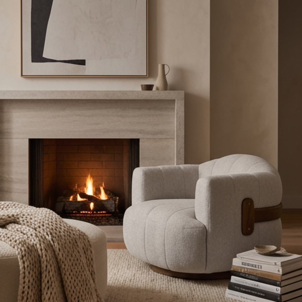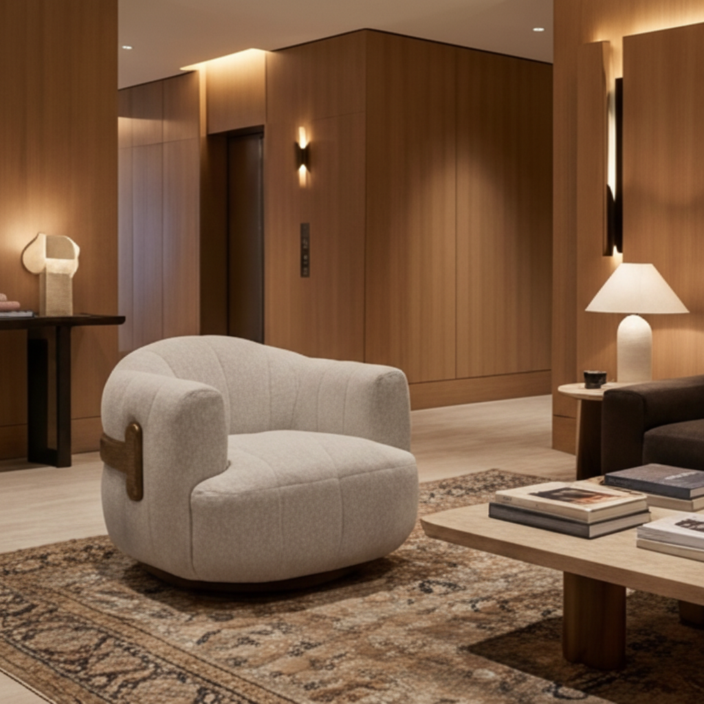 Bring elevated comfort and effortless movement to your living space with the Splendido Tadeo Cream Channeled Swivel Lounge Chair. Designed with a sculptural barrel silhouette and plush bolstering, this modern swivel armchair invites you to sink in and relax—perfect for conversation areas, reading corners, and stylish lounge settings. The dove cream textured upholstery adds a soft, light-neutral tone, while the warm brown oak wood swivel base grounds the look with natural warmth. A refined wood accent along the chair’s back, finished with antique brass details, creates a subtle statement that feels curated and upscale.