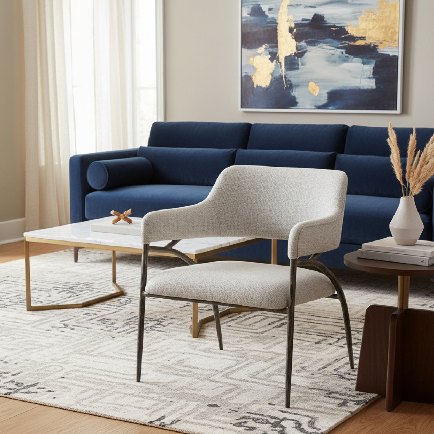 Meet the Vesterboro Accent Chair, an embodiment of luxury and resilience, suited for modern and Art Deco environments. This chair is elegantly wrapped in a boucle-style fabric, providing a rich, textured feel that elevates its aesthetic appeal. Its robust, forged-look steel frame ensures durability, perfectly balancing the fabric's softness. Ideal for adding a touch of sophistication to a hotel lobby or a living room, the Vesterboro's adaptable design seamlessly blends with various decor styles. Its combination of elegance and simplicity makes it a distinct piece, offering both comfort and chic style. The Vesterboro Accent Chair is more than a seat; it's a symbol of refined elegance.