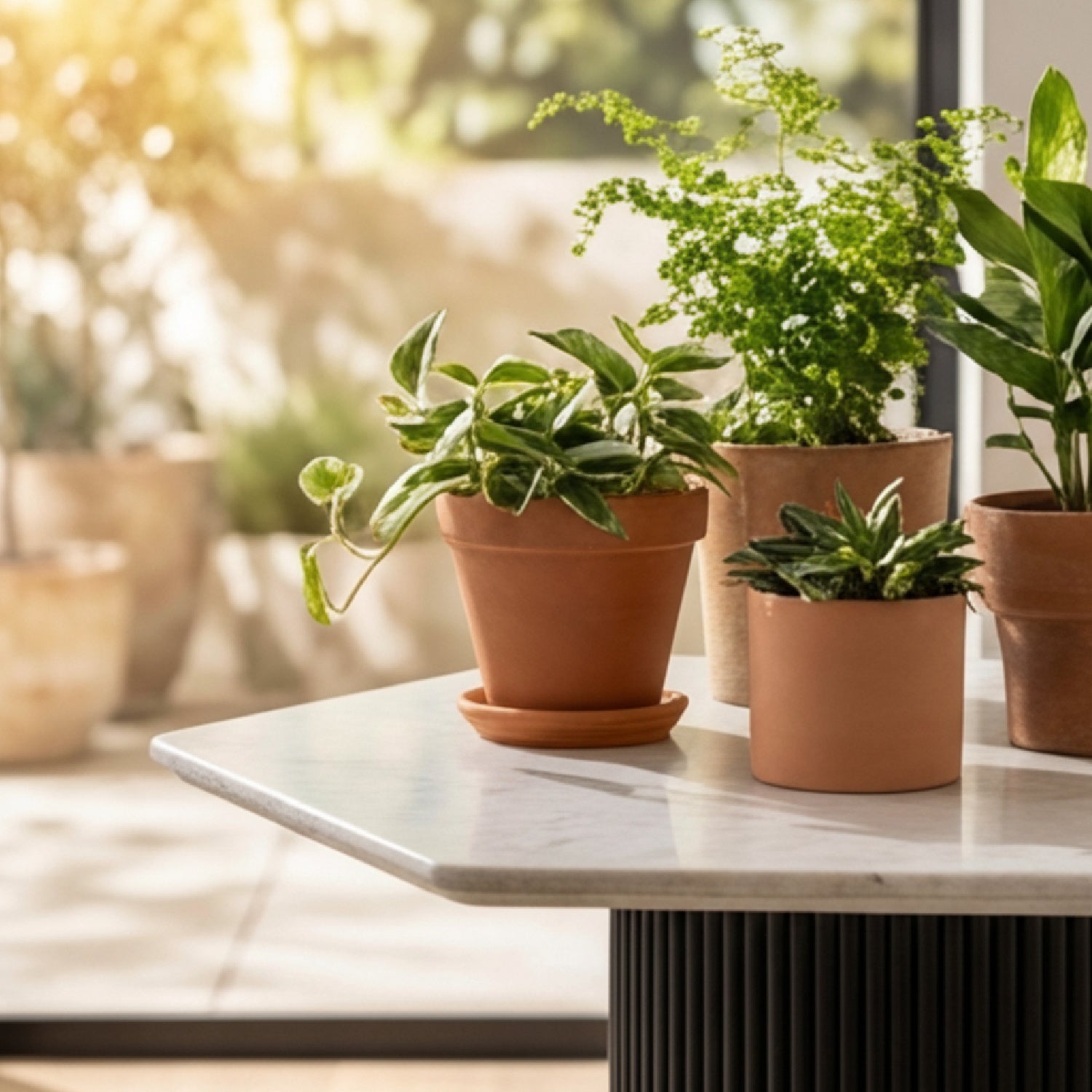 • Tabletop material: White marble (natural variation in veining and tone)