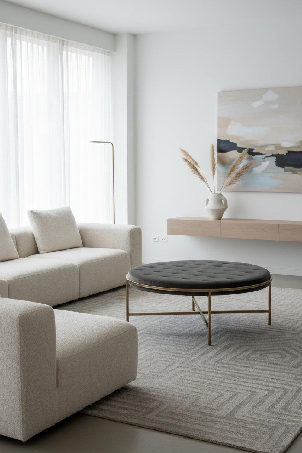 This large round ottoman exudes transitional flair. Stocked in our soft piccolo prosecco performance fabric with a rustic bronze steel frame. Can be used as a coffee table or as extra seating in residential and commercial spaces. Performance fabric is moisture repellent, durable, and easy to clean.
