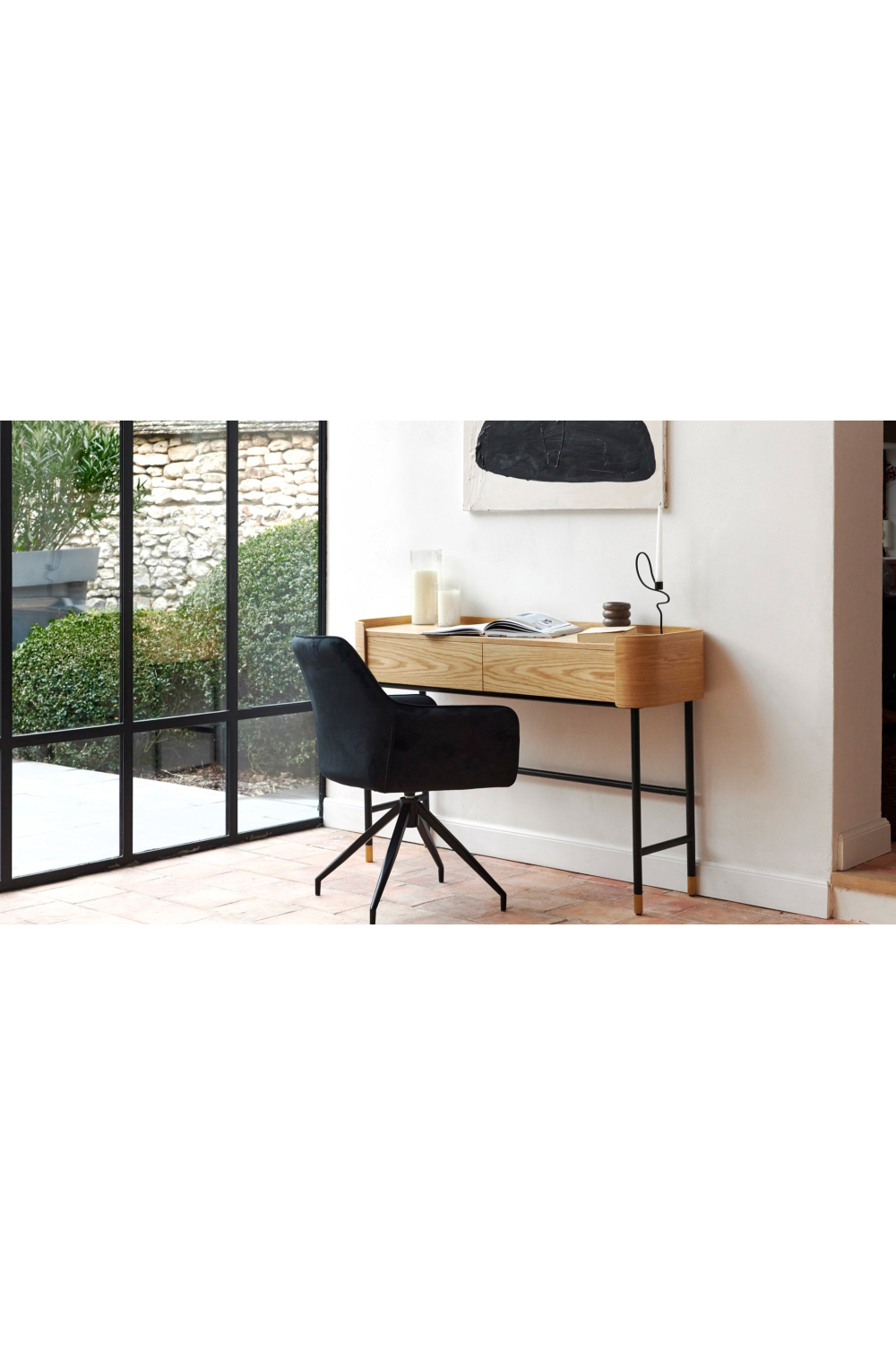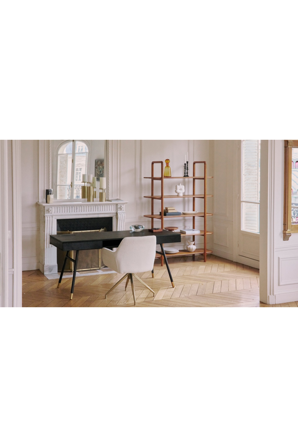 The Kingscross Tweed Swivel Office Chair by NV Gallery features an enveloping silhouette with plush padding across the seat, back, and armrests, all accented by elegant tufting. Available in soft textures like velvet and boucle, it rests on a sturdy, retro-inspired metal base in black or gold. Whether placed behind a desk or styled as a statement piece in the living room, Kingscross delivers both comfort and sophistication.