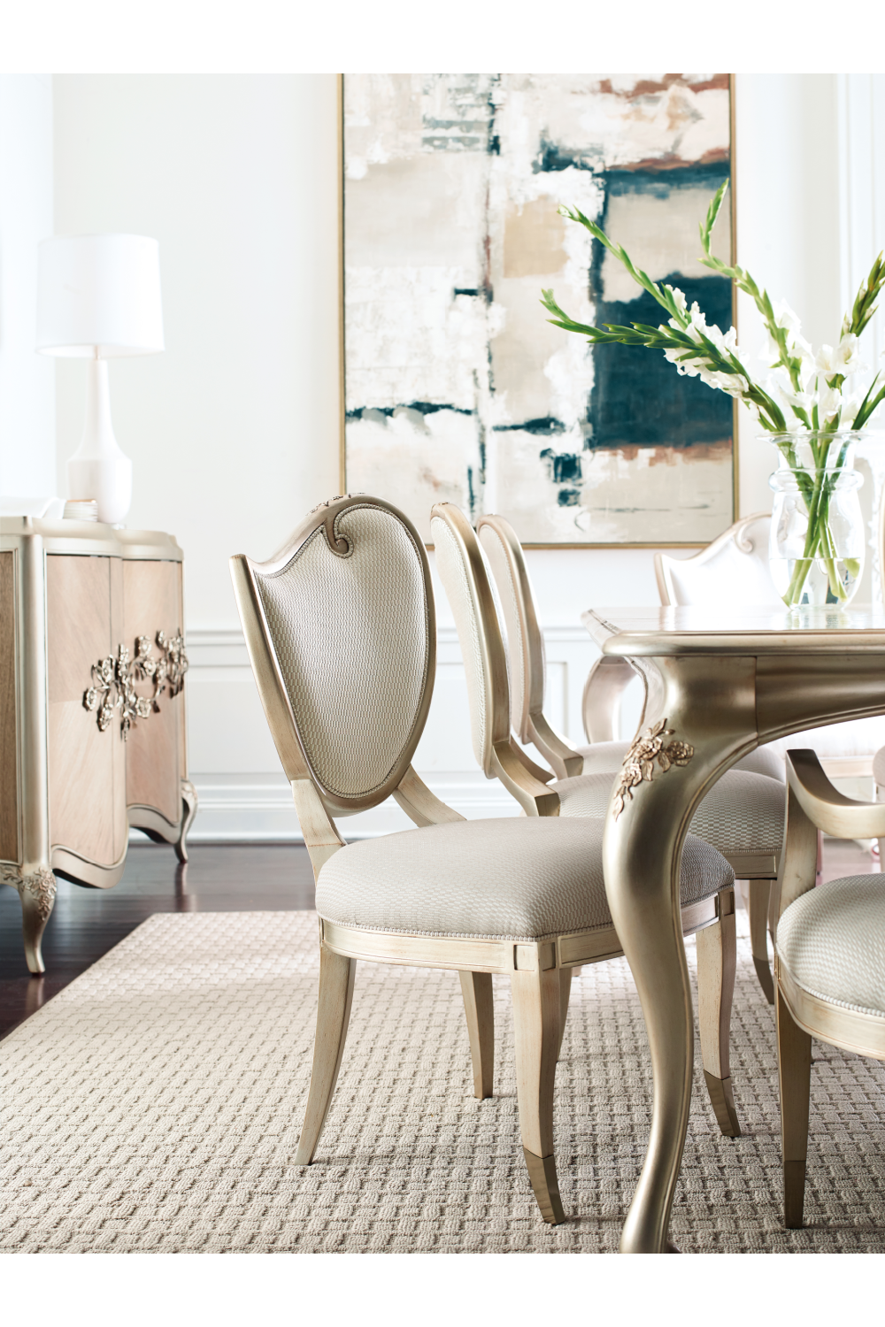 Offering timeless style and sophistication, this left-side chair makes a big style statement and features a sweeping carved scroll visible on the left side of the exterior when pushed into the table. Its asymmetrical design is highlighted with a Champagne Mist finish while carved elements are accentuated in Aglow. Metal ferrules lend contemporary character to its front legs and add another layer of luxury. Fully upholstered on the inside and outside, the comfort of this side chair is matched only by its beauty.