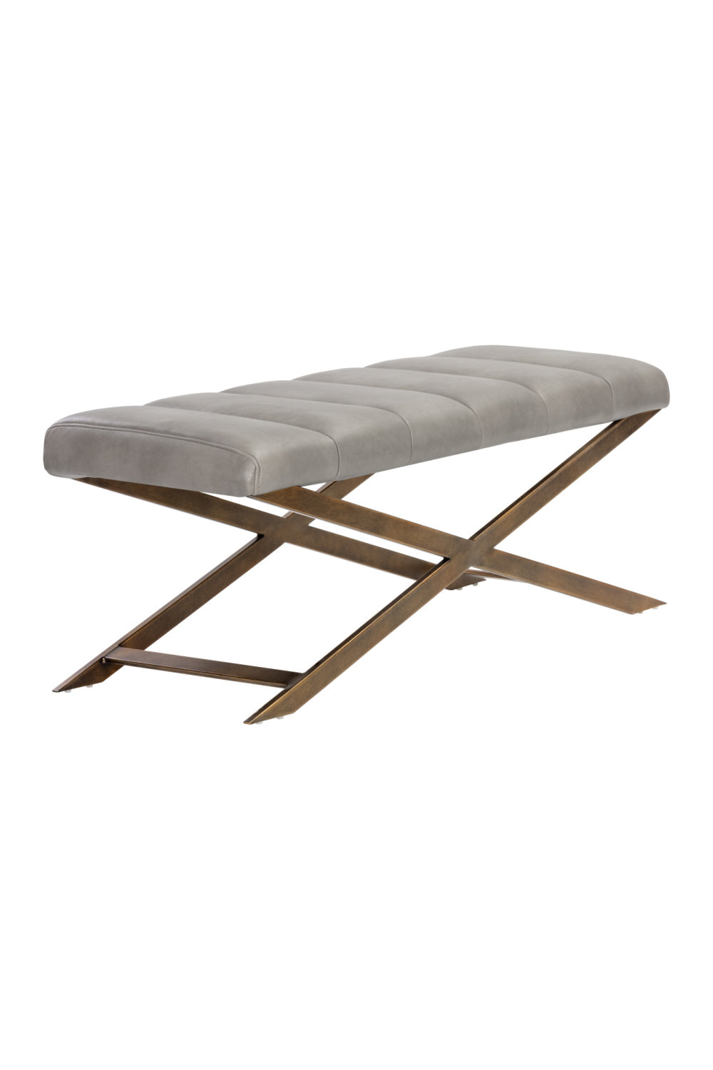 An elegant bench designed with modern warmth. Designed with channel tufting and an antique brass x-base. Available in bravo cream faux leather. Handle With Care: This design has been crafted with faux leather. Faux leather is manufactured to reflect the natural characteristics of leather; as such, color variations, markings, wrinkles, grooves, and light scratches are appreciated characteristics. No two pieces will be alike. Visit our Product Care page for more information on how to ensure the lasting beauty of this piece.