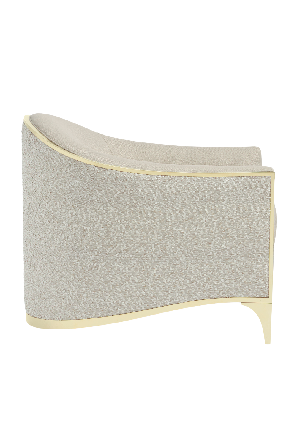 Our elegant Svelte Chair is graceful in every respect and from every angle. Inspired by Italian design in the mid-century, this chair’s extraordinary silhouette is simply breathtaking. This barrel chair is the epitome of refined beauty. Its top rail gently slopes forward while its base gracefully sweeps downward from its sculptural Majestic Gold front legs to balance on the floor in the back of the chair. The chair’s interior and loose seat cushion feature a shimmering basketweave fabric in a lovely Moonstone hue while the chair’s exterior is meticulously upholstered around its barrel back in a tone-on-tone novelty eyelash embroidery. The exposed gold frame wraps the chair in just the right touch of brilliance. Try grouping four or more chairs around a circular cocktail table in a small den, or library for the perfect conversation area.