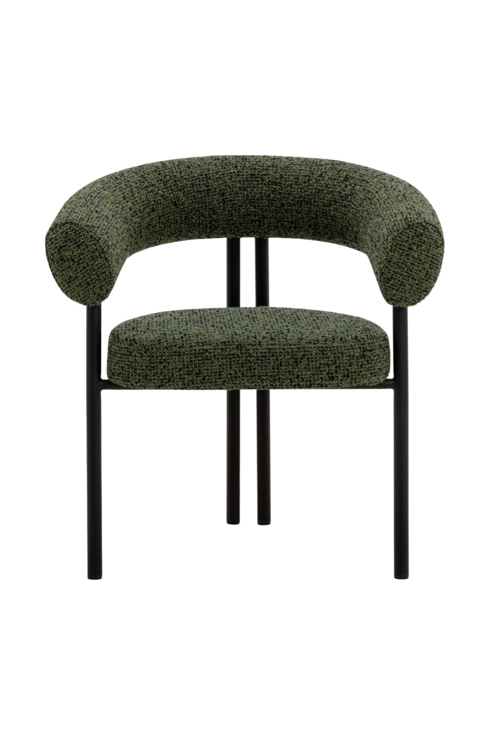 The Oniva Dining Armchair brings tactile personality with playful curves and richly textured fabric. A rounded seatback enhances comfort with plush contours that offer gentle support, while the black iron legs ground the piece with a sleek, modern presence.