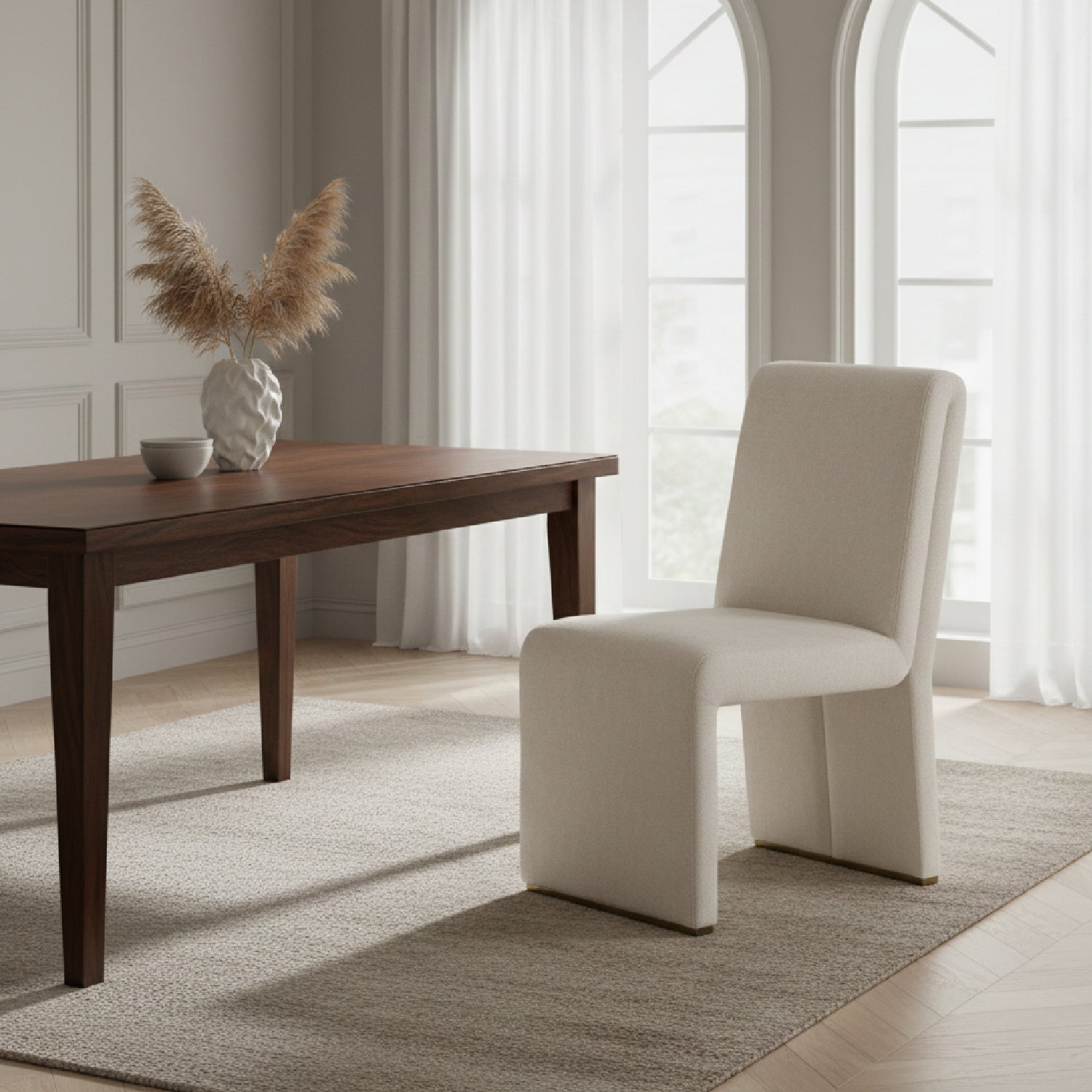 The Modrest Bounty Dining Chair Set offers a harmonious blend of contemporary sophistication and timeless charm. Upholstered in soft beige fabric, the chairs exude warmth and elegance, complemented by antique brass legs that add a subtle touch of luxury. Their solid back design and meticulous craftsmanship make them as comfortable as they are stylish. Perfect for elevating any dining space, these chairs bring a refined ambiance to your modern home, seamlessly merging function with high-end aesthetics. Imagine them gracing your dining room, creating a welcoming and polished atmosphere for every gathering.