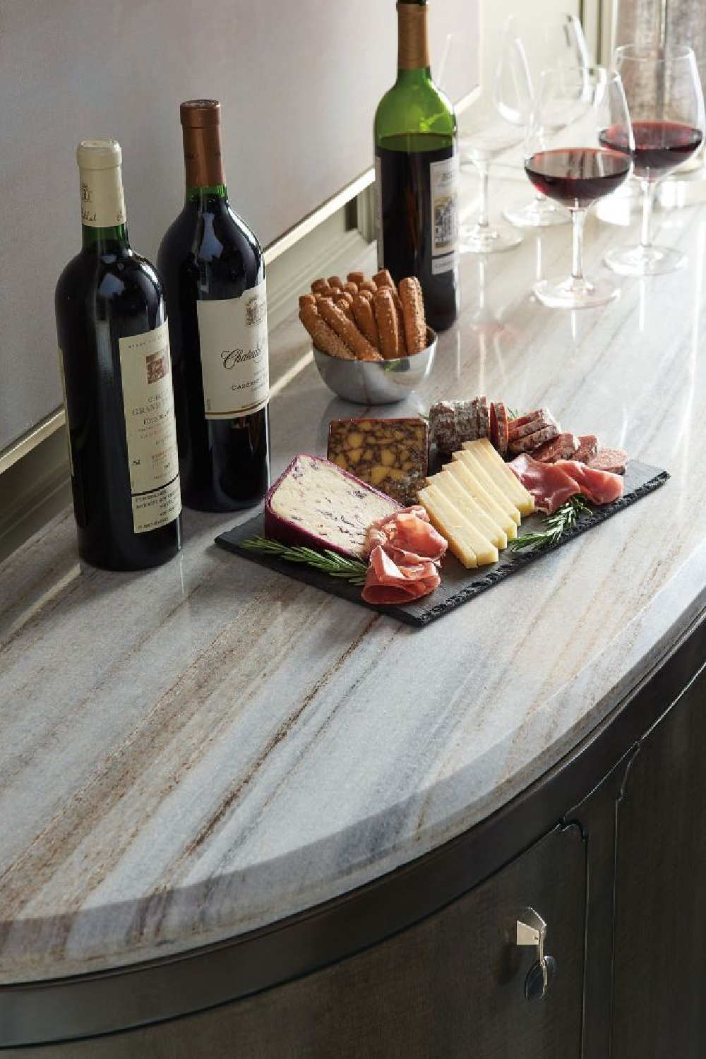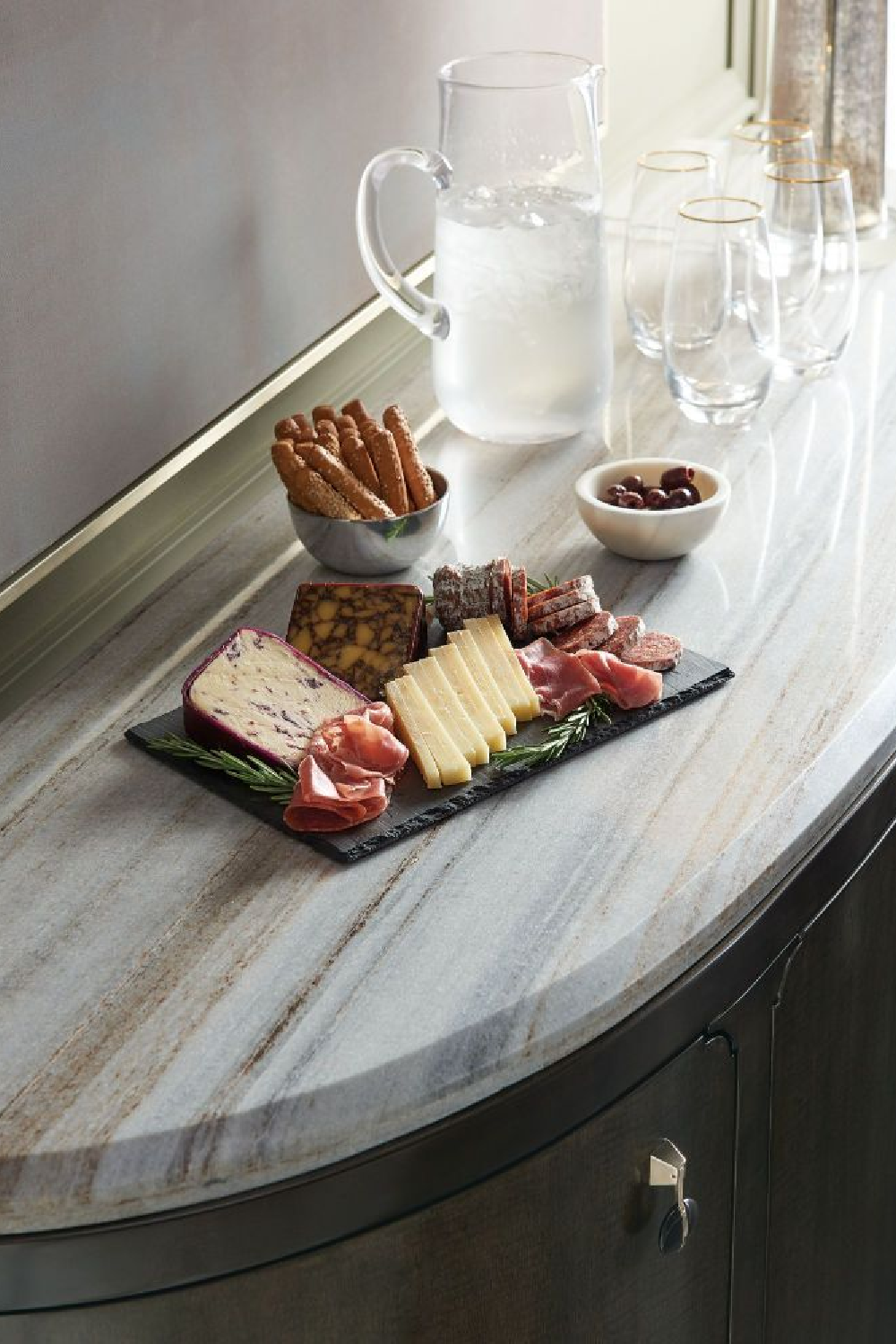 A vision in the beauty of contrast, this fascinating half-moon console wears a dark, Charcoal Anegre finish and a Blue Sandstone top. Each of its four doors is highlighted by jewelry-like pulls and opens to reveal a Seal Skin interior. Inside, a storage drawer and adjustable shelves ensure everything has a place. With dramatic charm, its modern attitude is assured with the addition of metal ferrules in Whisper of Gold. This is just the piece to design a room around.