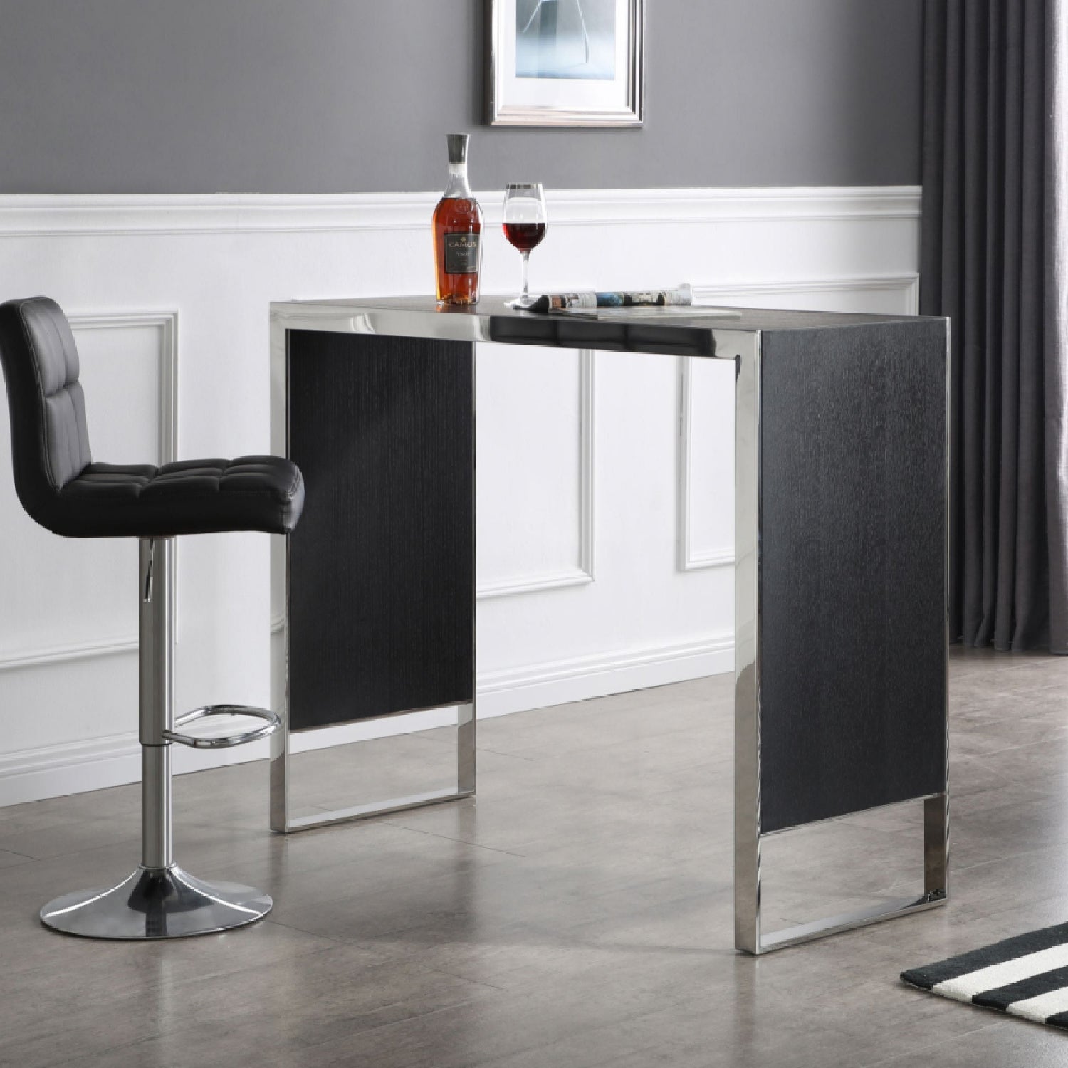 The Manston Bar Table's sleek and minimalist design is everything you've always wanted for that drabby corner that definitely needed to be lightened up. The bar's top and sides have a black oak veneer lined with stainless steel accents. So, what are you waiting for? Add this bar top to your home and start entertaining tonight.