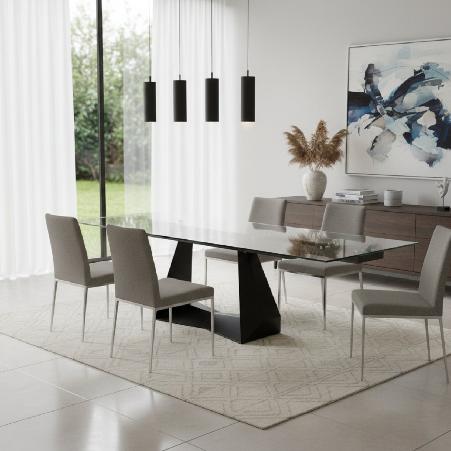 The Modrest Maroney Modern Black and Glass Extendable Dining Table is a stunning and versatile piece of furniture that combines contemporary design with functionality. Crafted with a black powder-coated steel base and a clear tempered glass top, this dining table exudes elegance and sophistication. Its extendable feature allows it to effortlessly transform from a compact 70.5-inch table to an expansive 106-inch table, making it ideal for accommodating both intimate gatherings and large dinner parties. The sleek, angular legs provide stability and add a touch of modern flair. With its seamless blend of black and glass, this dining table is a stylish addition to any dining space, offering both aesthetic appeal and practicality.