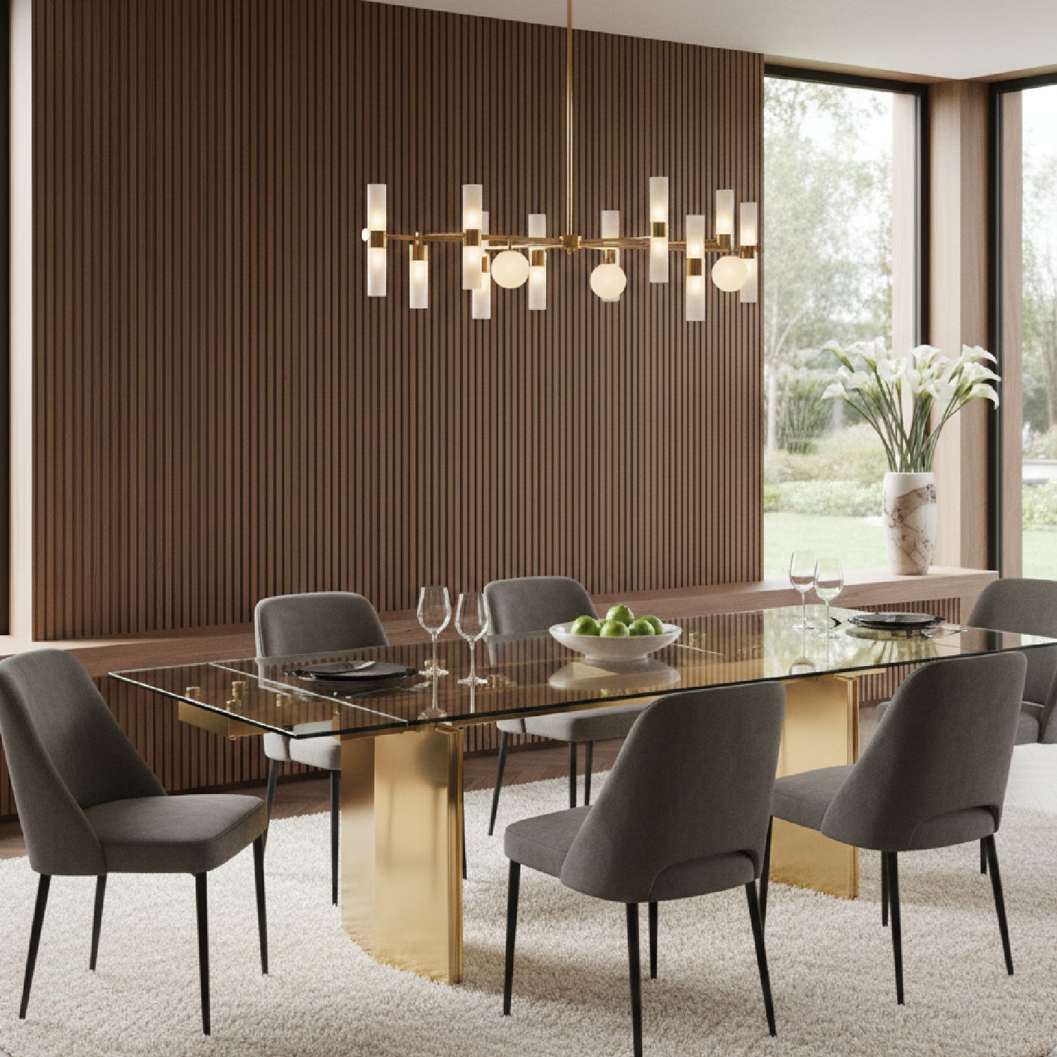 The Nassim Extendable Dining Table is the perfect example of luxury textures mixed with a rough industrial sensibility. The tempered glass top has a clean and elegant look to it while the stainless steel legs are covered in a gold finish that gives the Nassim an opulent look in any space. With the table fully extended, the table can provide seating up to 10. Pair with a bold colored velvet dining chair for a glam space.