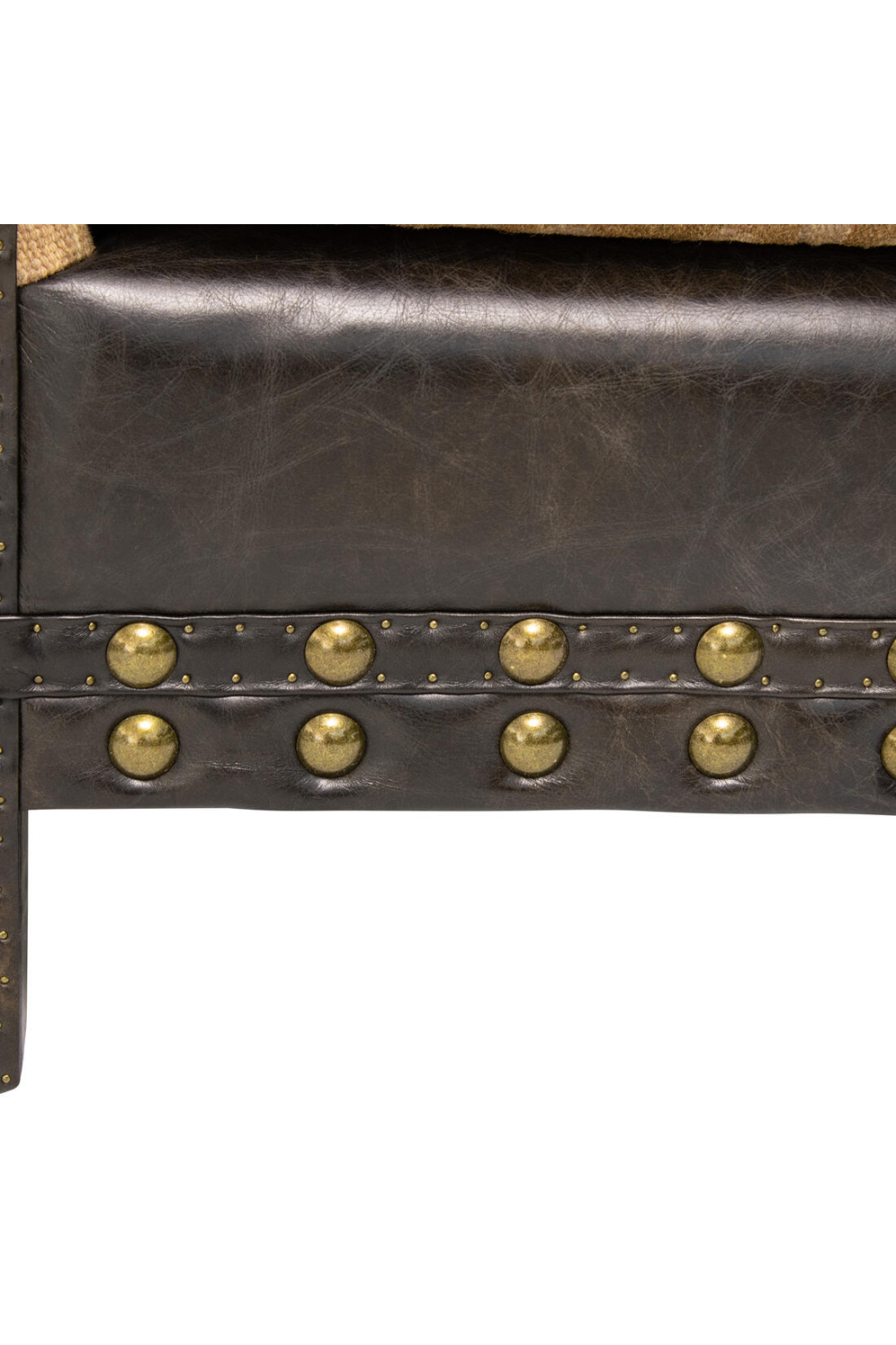 A classic armchair in worn fudge brown leather with a richly colored carpet kilim on the back and sides designed by Andrew Martin. With big, brass stud detailing on the profile, Marlborough is the epitome of old-world charm. Sink back into this and smoke a cigar to complete the look.