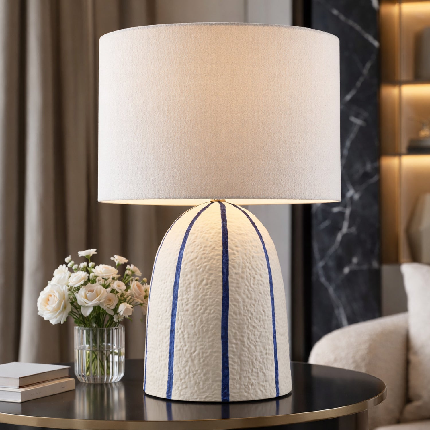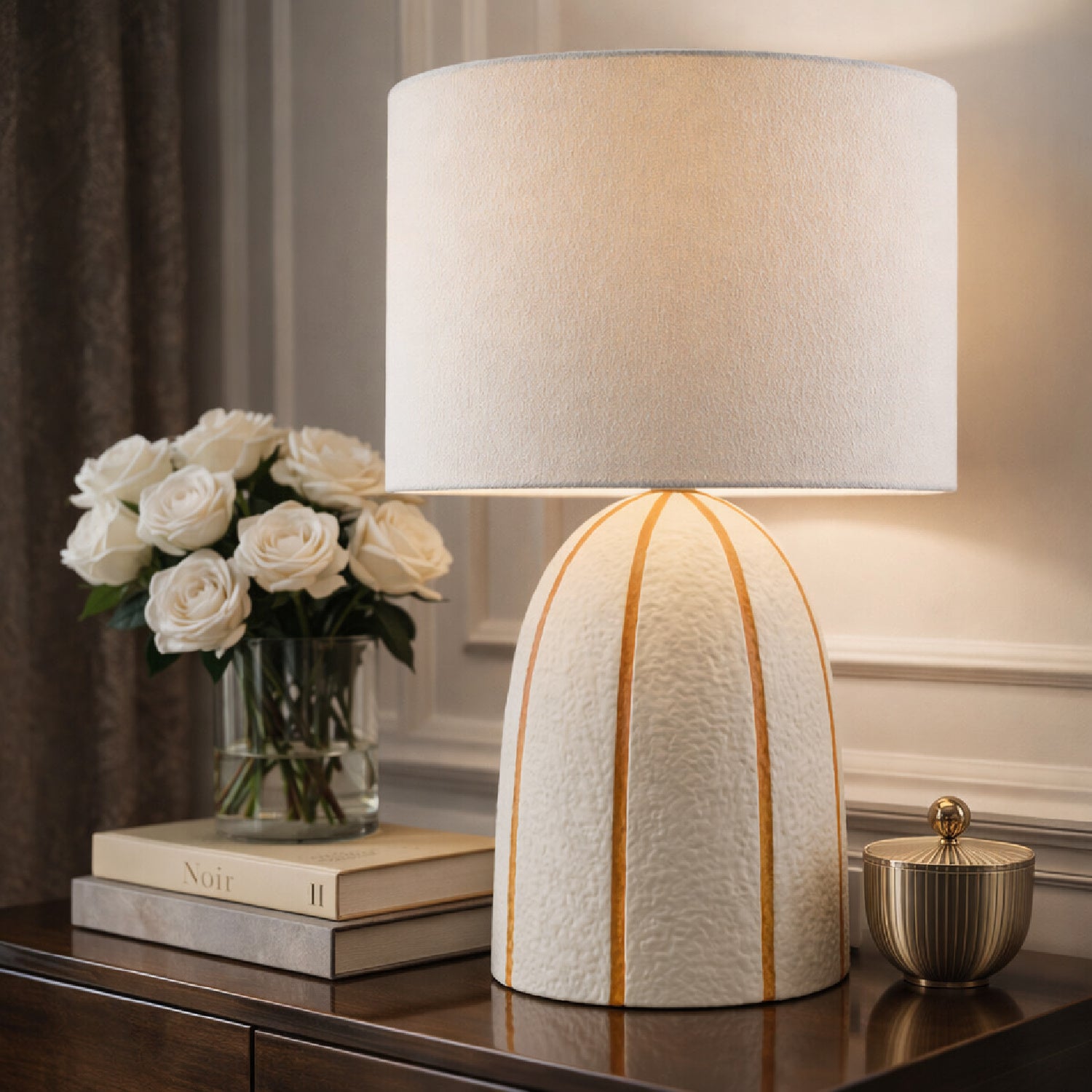 Vertical Lined Ceramic Table Lamp . The lamp's body is crafted from sleek ceramic, complemented by a sturdy iron base that ensures stability while enhancing its timeless appeal. Topped with a dual-fabric shade linen on the outside for an understated texture and polyester inside for a soft glow it diffuses light beautifully, creating an inviting atmosphere. Manufactured in Cambodia, this lamp is both stylish and easy to maintain; simply wipe clean with a dry cloth to keep it looking pristine. Add the Hombori table lamp to your home decor collection and experience the perfect blend of tradition and modernity.