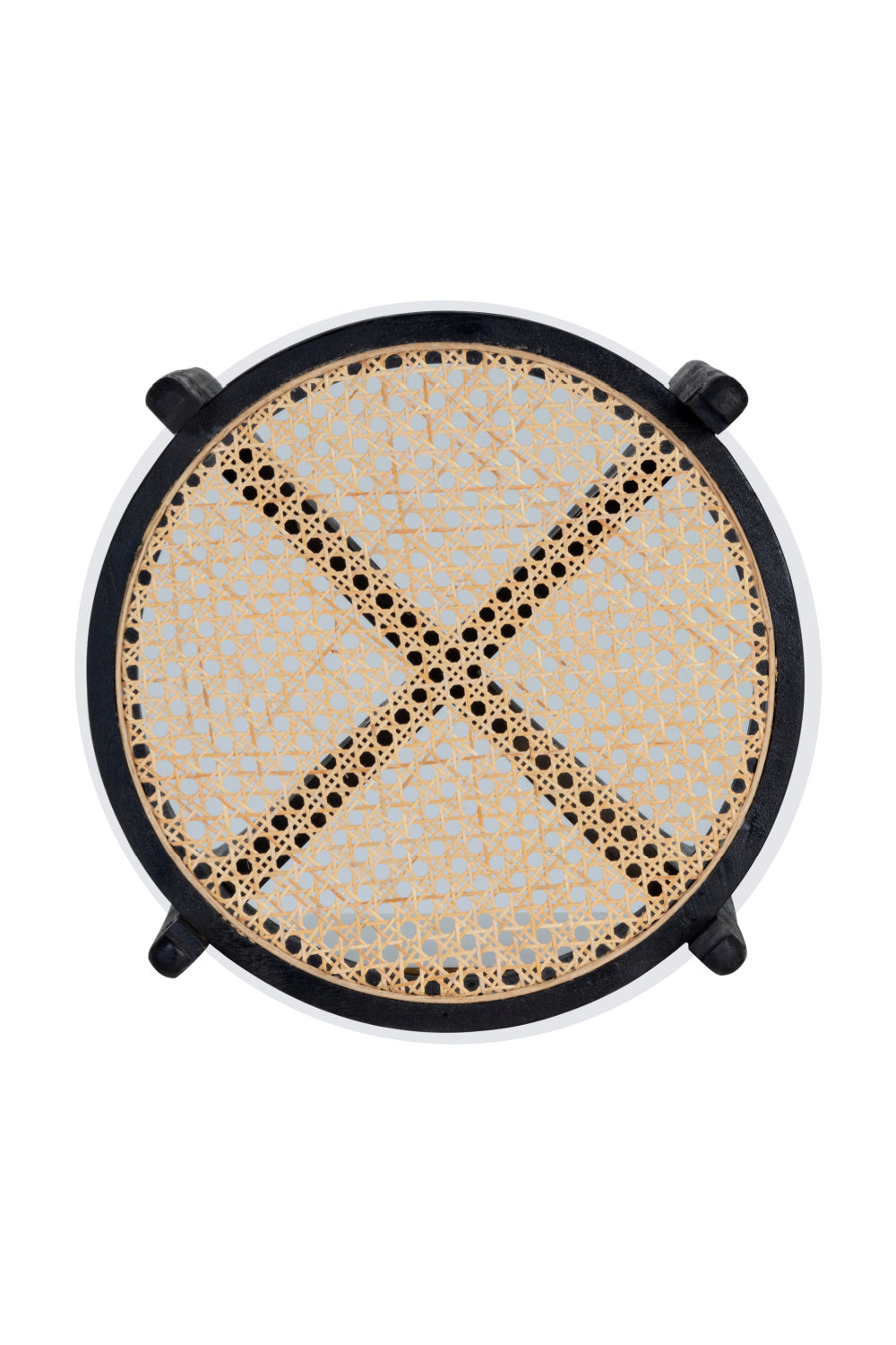 Inspired by global travels, this round end table combines old world influence with modern style. Features natural rattan top covered with clear glass and a sculpted black mango wood base. An intriguing design from all angles. Coordinating coffee table also available. Made in India. With refined craftsmanship, this design was brought to life by skilled local artisans. By nature, these materials develop unique imperfections, such as fissures, markings, and color variations, for a truly one-of-a-kind piece. Handle With Care: This design has been crafted with rattan. This artisan-crafted material features intricate weaving that results in natural variations where no two pieces are alike. Colour and texture differences are to be expected and embraced with this natural material. Due to the weaving process used, the fibres in this material may display shorter or longer lengths where the weaving ends. Visit our Product Care page for more information on how to ensure the lasting beauty of this piece.