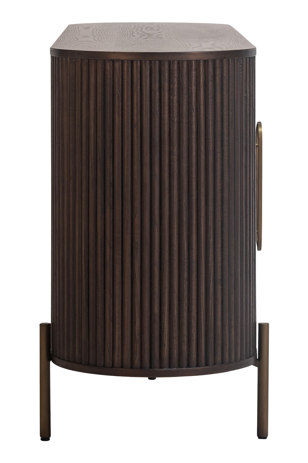A chic four-door cabinet crafted from oak wood in a dark finish and vintage brass metal accents. Luxor by OROA features a unique aesthetic with its oval top and softly ridged veneers. It offers four compartments to organize your essentials.