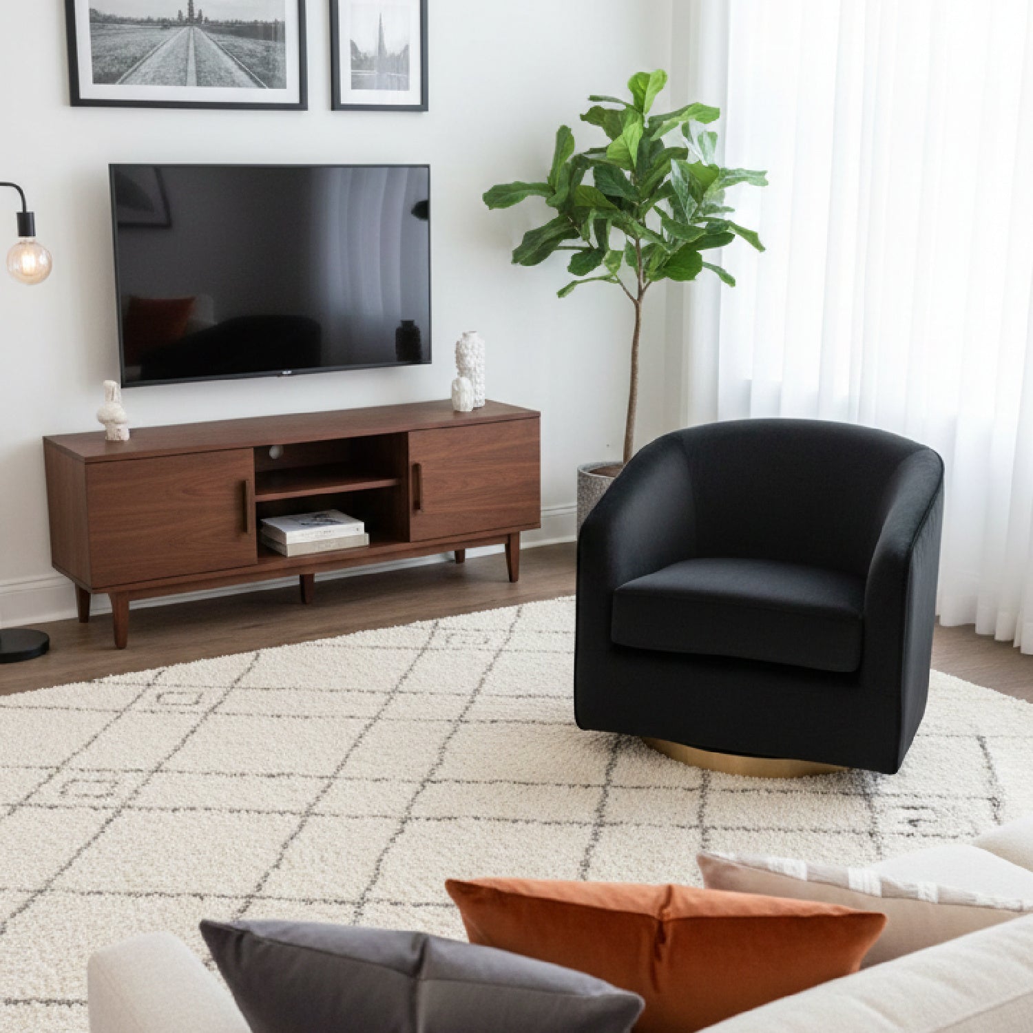 A stylish and comfortable swivel chair perfect for living, lounge and office spaces. Features a barrel back design upholstered in fabric. A brushed antique brass round base with 360 degree swivel completes the design.