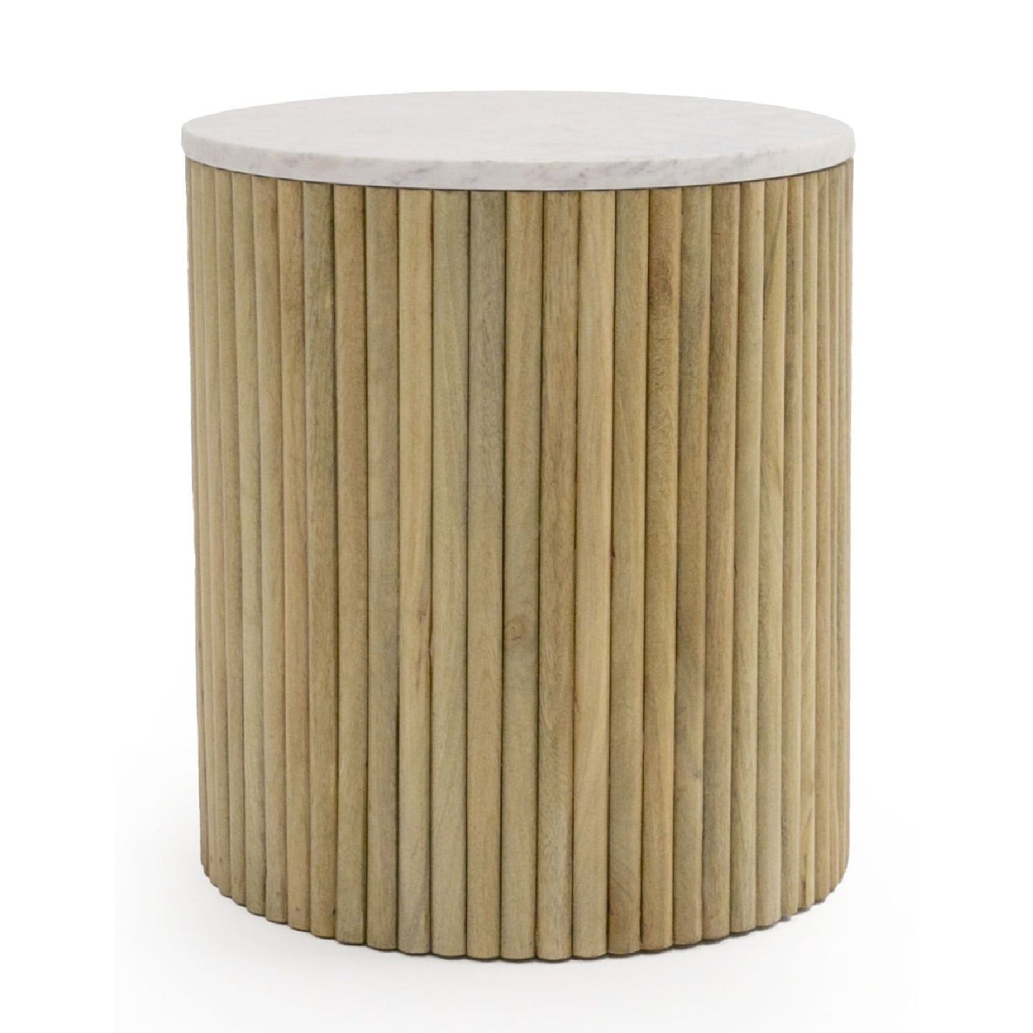 Update your living room with the Modrest Cambridge Round End Table! This Modern table features a Carrara white marble top and a Trestle Mango drum base. The Cambridge combines excellent quality materials and a unique design that makes it a a perfect fit for your living space.