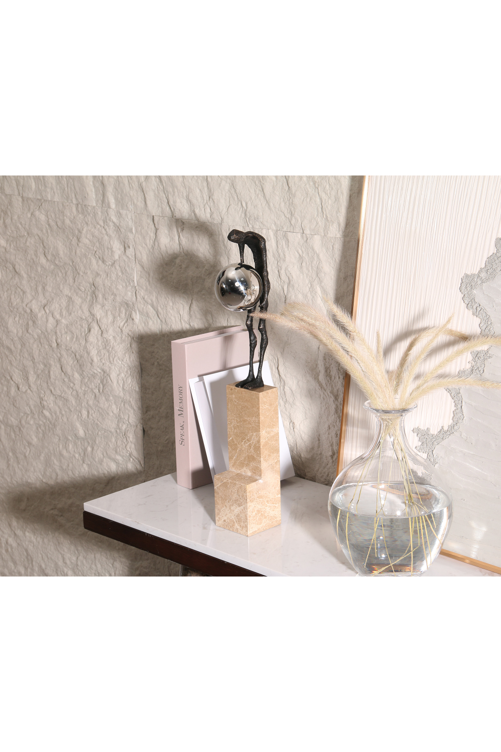 The Contemplation Sculpture, crafted from dark bronze and light brown marble, is a sophisticated piece that encourages reflection through its serene elegance. With flowing lines and balanced proportions, it exudes tranquility, making it perfect for both residential and hospitality settings. Add a touch of balance and peace to your space with this exquisite art piece.
