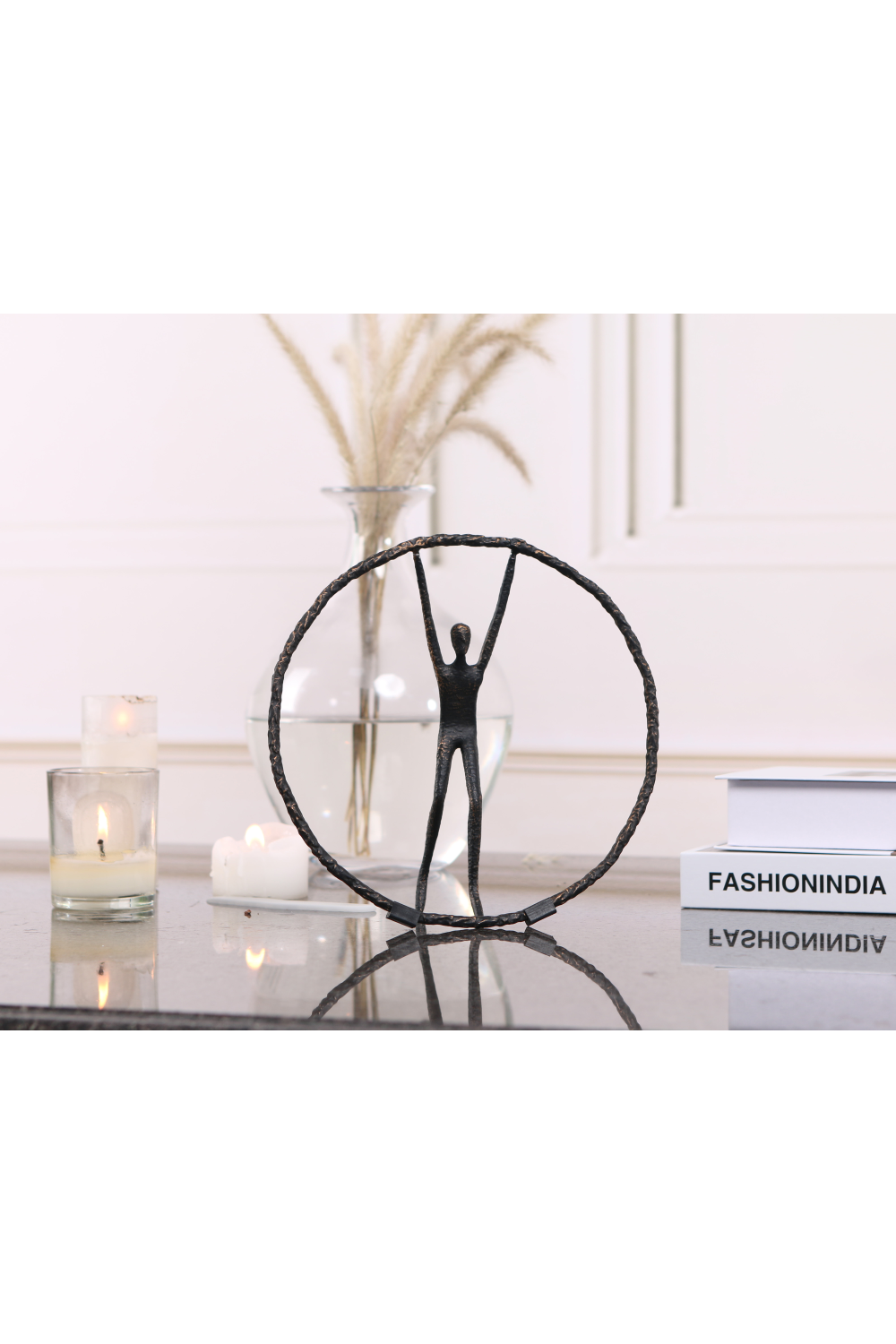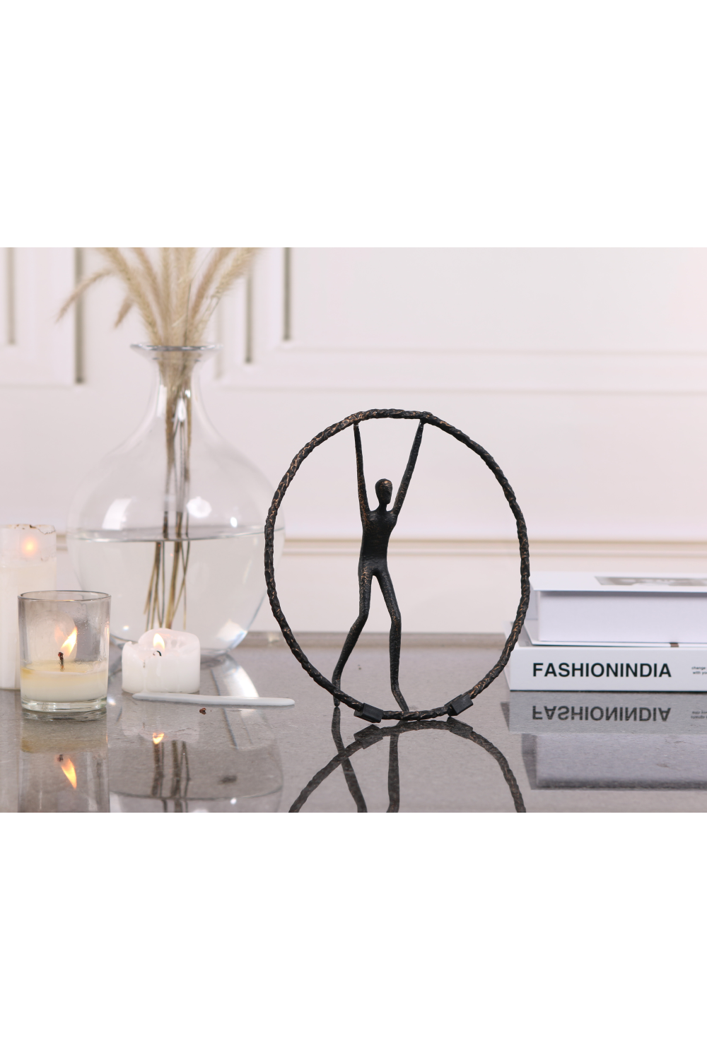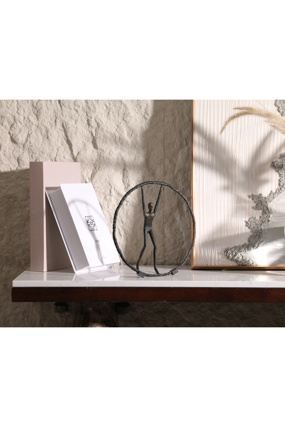 Captivating yet understated, Riley, a black zinc alloy sculpture, commands attention with its geometric abstract design. Its simple yet mesmerizing circle, with a person gracefully balancing atop, exudes a playful sophistication. This unique piece, suited for both residential and hospitality settings, adds a touch of intrigue to any living room lounge or study.