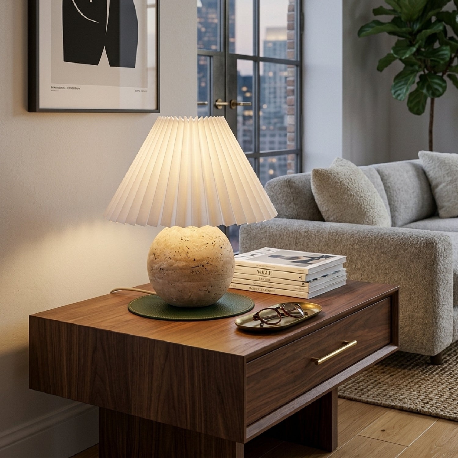 Pleated Linen Travertine Table Lamp | Kuda Home Bajo