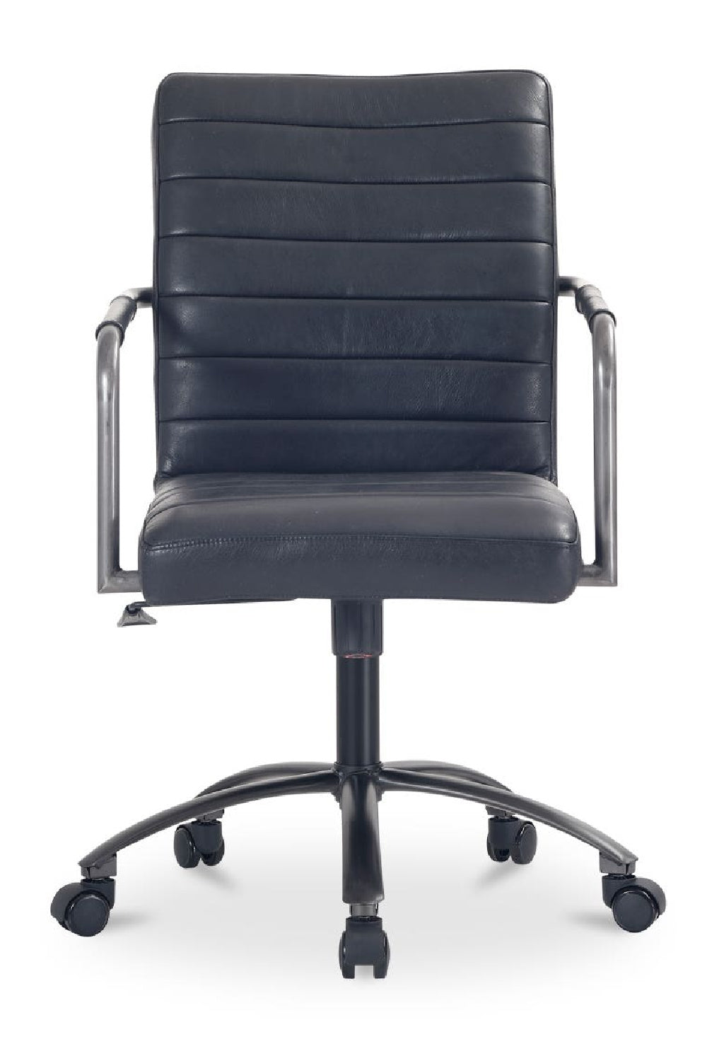 The Roy office chair's channel-seamed upholstery, tailored in top-grain leather, offers comfort and support for extended work sessions. Its leather-wrapped armrests infuse warmth into the iron frame. The chair's ergonomic design promotes better posture, adapting seamlessly to a variety of interior settings without the traditional office feel.