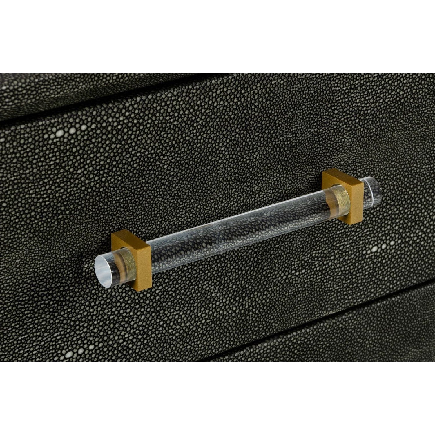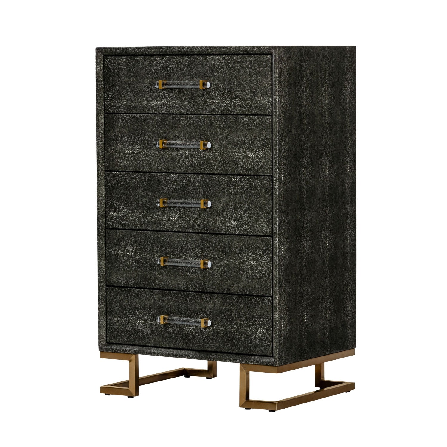 The Howard Chest is a stylish piece for your modern glam home. A textured vegan leather finish creates great depth in this incredible chest. Gold legs and accents make a bold statement while acrylic handles soften the rough textures. Five drawers create space for all of your needs while still appearing incredibly stylish. Pair with a fur rug and velvet accent chair for a beautiful vignette in your bedroom.