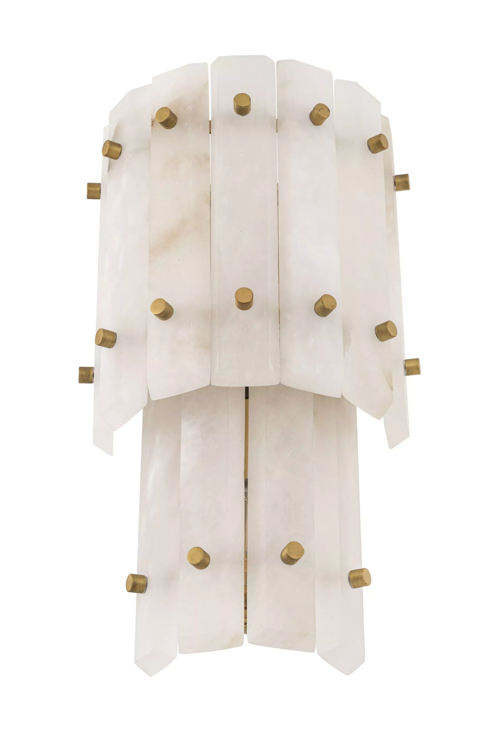 Illuminate your interior stylishly with Wall Lamp Blason. Mounted on a semi-circular antique brass fixture, plates of translucent alabaster spread an ambient light on surrounding surfaces.
