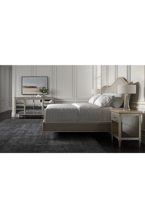 This nightstand is a beautiful reflection on your style. The case exemplifies a modern interpretation of linear Italian design with the addition of a lustrous Auric silver leaf finish and bevelled antique mirror facades. This carved chest features three soft-close drawers with custom-designed square metal/mirrored pulls. The interior is finished in sparkling Gold Bullion Paint. Beautifully carved square tapered feet with metal ferrules make this a regal piece to stand beside a luxurious bed.