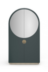This stately armoire is the epitome of post-modern Italian aesthetics. At home in a living room, study or bedroom, its arched form is dressed in an impressive high-gloss finish that celebrates its rich Apatite green or Caramello brown color. Two doors are graced with a large, circular Smoked Bronze mirror. A round, inset split-pull in Whisper of Gold opens the doors to reveal the piece’s multi-functional versatility with one adjustable shelf, a touch-latch pull-out writing surface and four drawers with pull-tab guides in Whisper of Gold. A plinth base with delicate corner flourishes is finished in hand-applied shimmering Oracle leaf.
