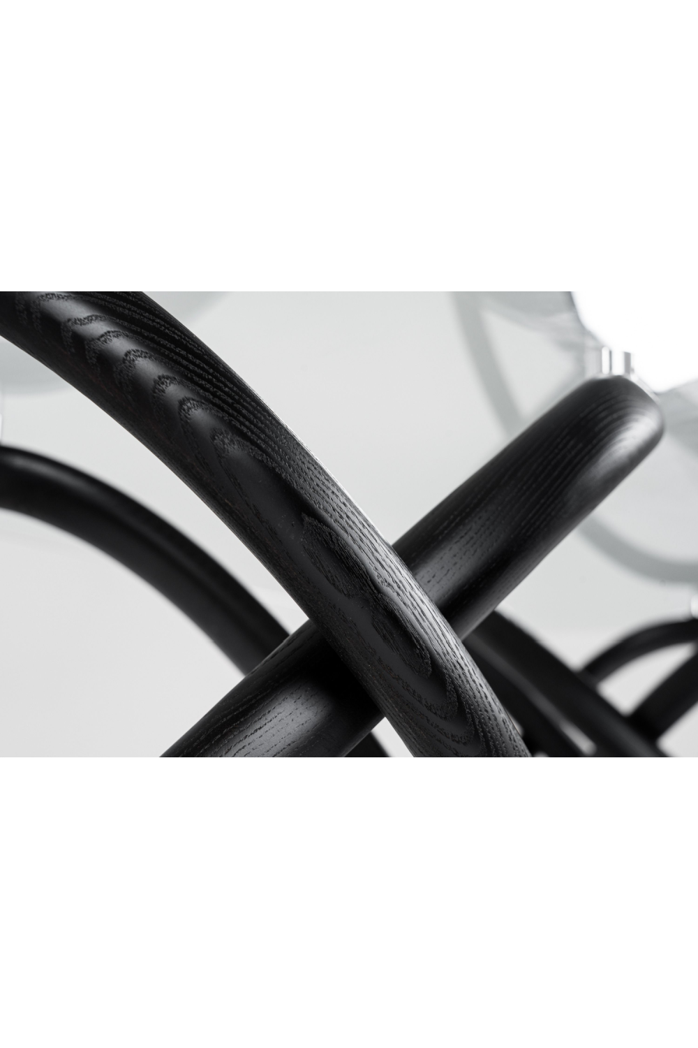 The Modrest Mason Modern Glass & Black Ash or Walnut Dining Table exudes ingenuity featuring an intersecting spherical black finished solid ash wood base that reminds of a modern art display. A clear glass top sits along the top as if floating. This Zen table is sure to shine in a modern, contemporary, or mid-century style home. Pair with any of our Mid-Century dining chairs for a perfect match.